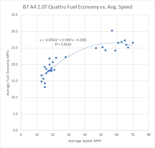 The next thing I am interested in is the relationship between MPG and speed. It is well-known that cars (excluding some hybrids) use less gas on the highway. But I want to know a detailed function of fuel economy vs. speed. The Audi TC records average speed, which comes in handy. The relationship is shown in the graph below.
