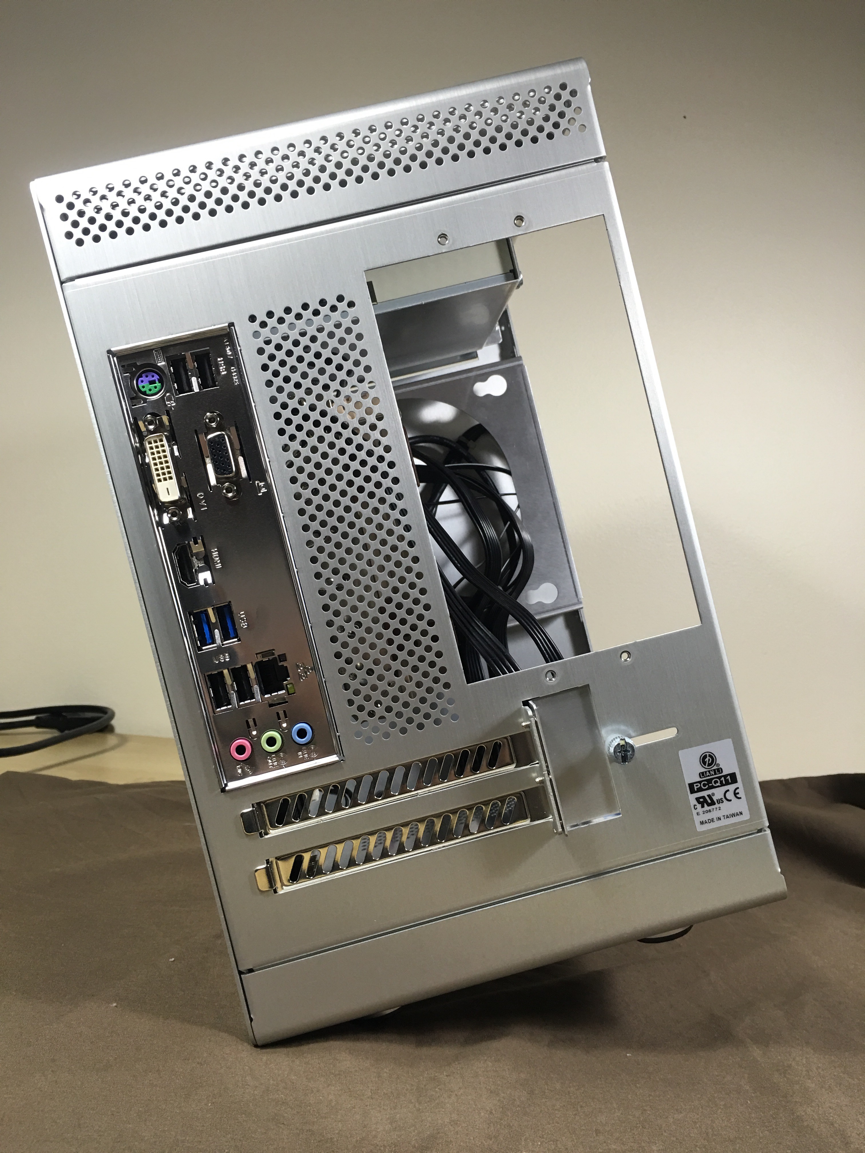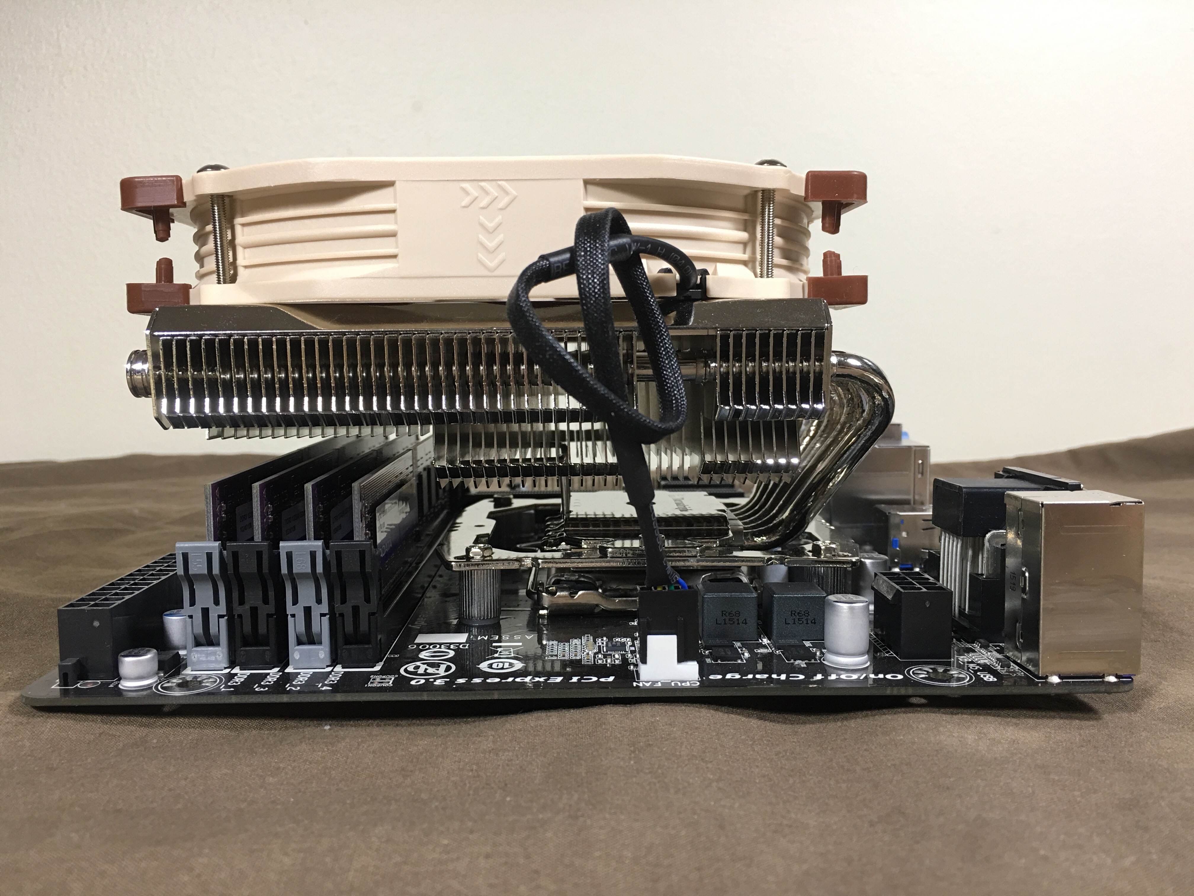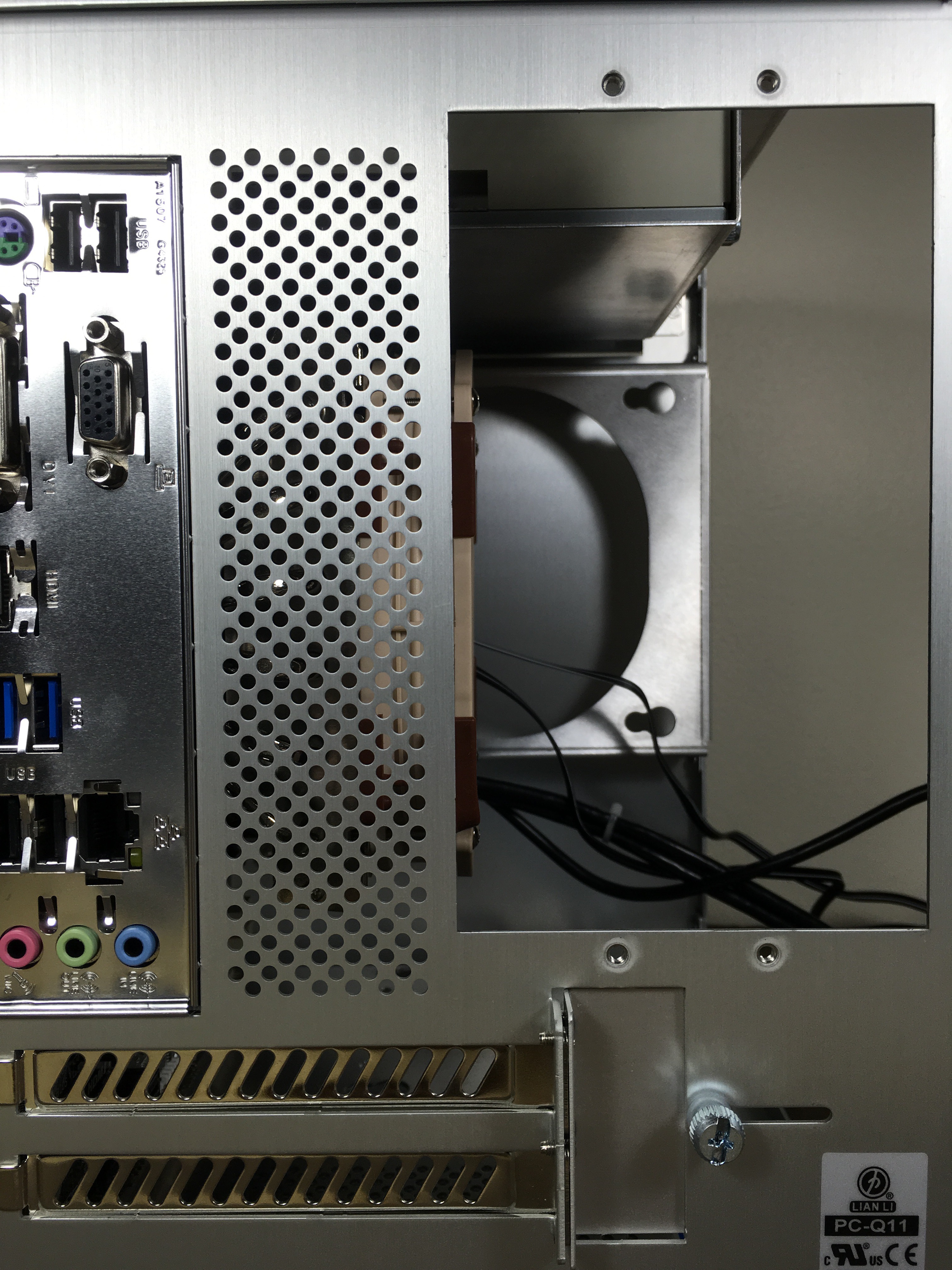 Because a PC-Q11 is likely to be placed on a tabletop and close to the user, I want the system to be quiet. For this I used a large heatsink, Thermalright AXP-200, and an even larger fan, Noctua NF-A15.